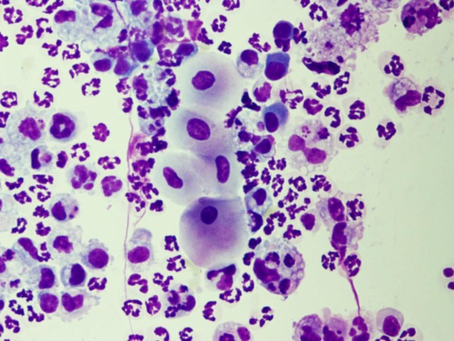 Ursachen von Abmagerungen können unter anderen: hohe Wurmbürde des Magen-Darm-Traktes, Sandablagerungen im Darm, chronische Darmerkrankungen, auszehrende Erkrankungen wie Neoplasien (Tumore), Magengeschwüre, chronische Nierenerkrankungen, chronische Entzündungen, chronischer Schmerz, geriatrische Probleme, endokrine Erkrankungen und Stoffwechselkrankheiten und viele mehr sein. Dementsprechend gestaltet sich die Diagnostik meistens unter Einsatz vielfältiger Untersuchungsmethoden wie Labordiagnostik, Röntgen, Ultraschall (Abb.1), Endoskopie, Punktion von Körperhöhlen, Organbioptaten, Zytologie von Punktaten und Bioptaten (Abb.2) und vielem mehr. Bei besonderen Fragestellungen arbeiten wir regelmäßig in diesen Fällen eng mit anderen Instituten der Freien Universität (Institut für Tierpathologie, Institut für Tierernährung, Institut für Parasitologie, Institut für Mikrobiologie, u.a.) oder aber mit spezialisierten Instituten bundesweit zusammen.